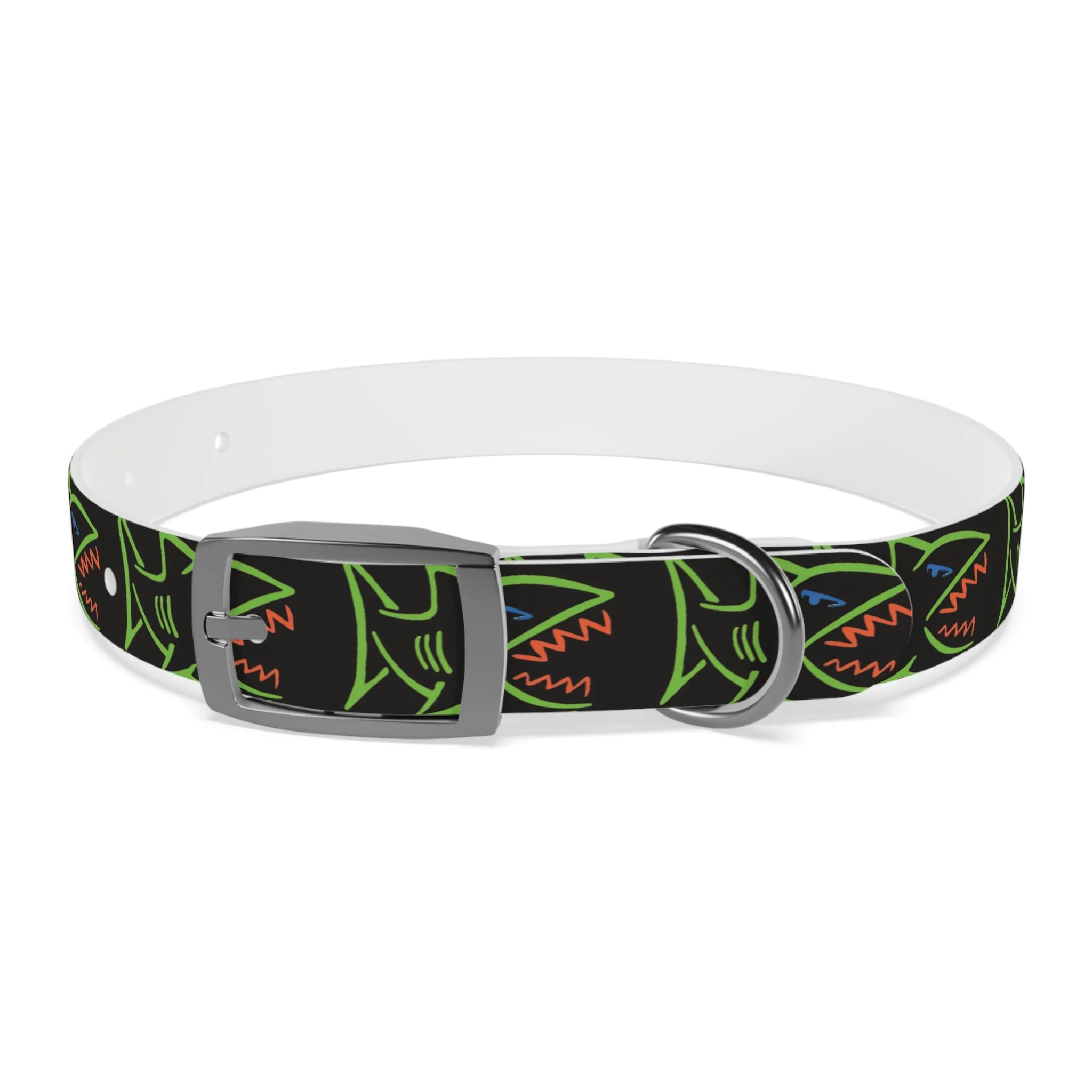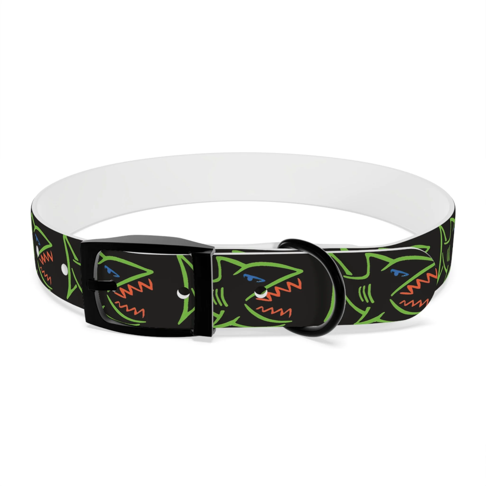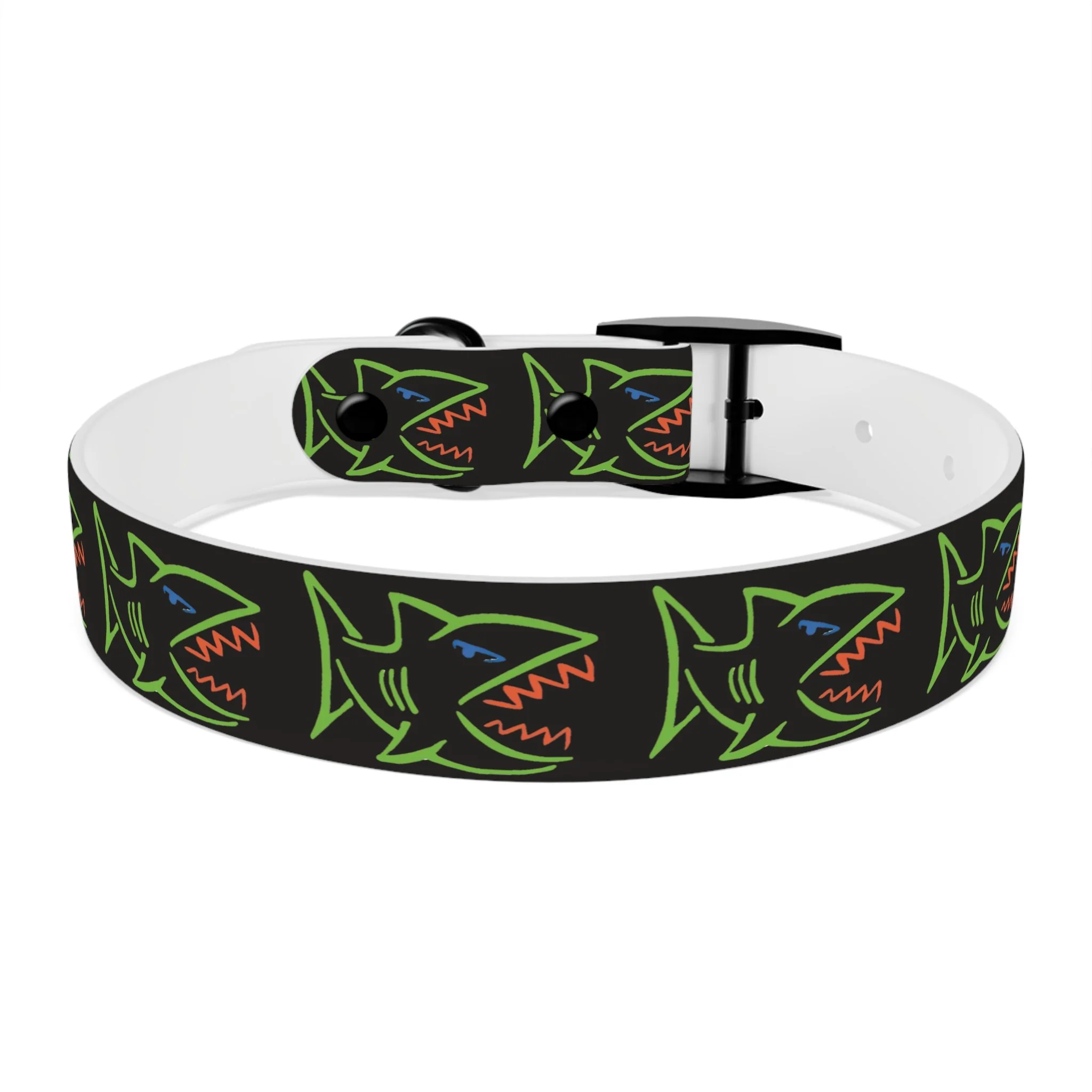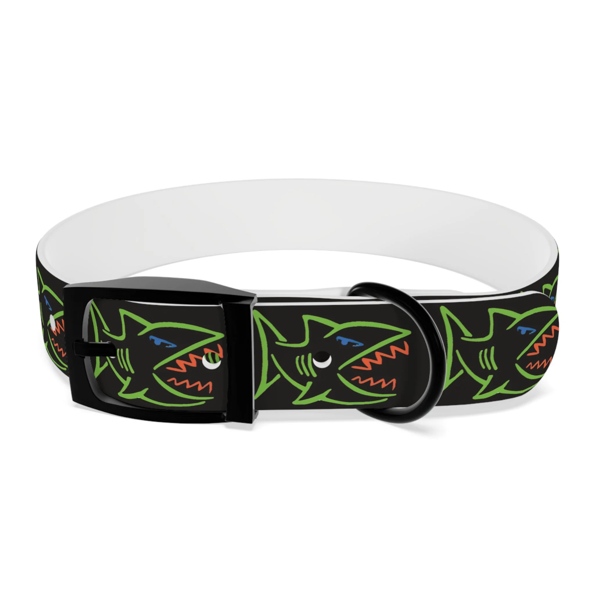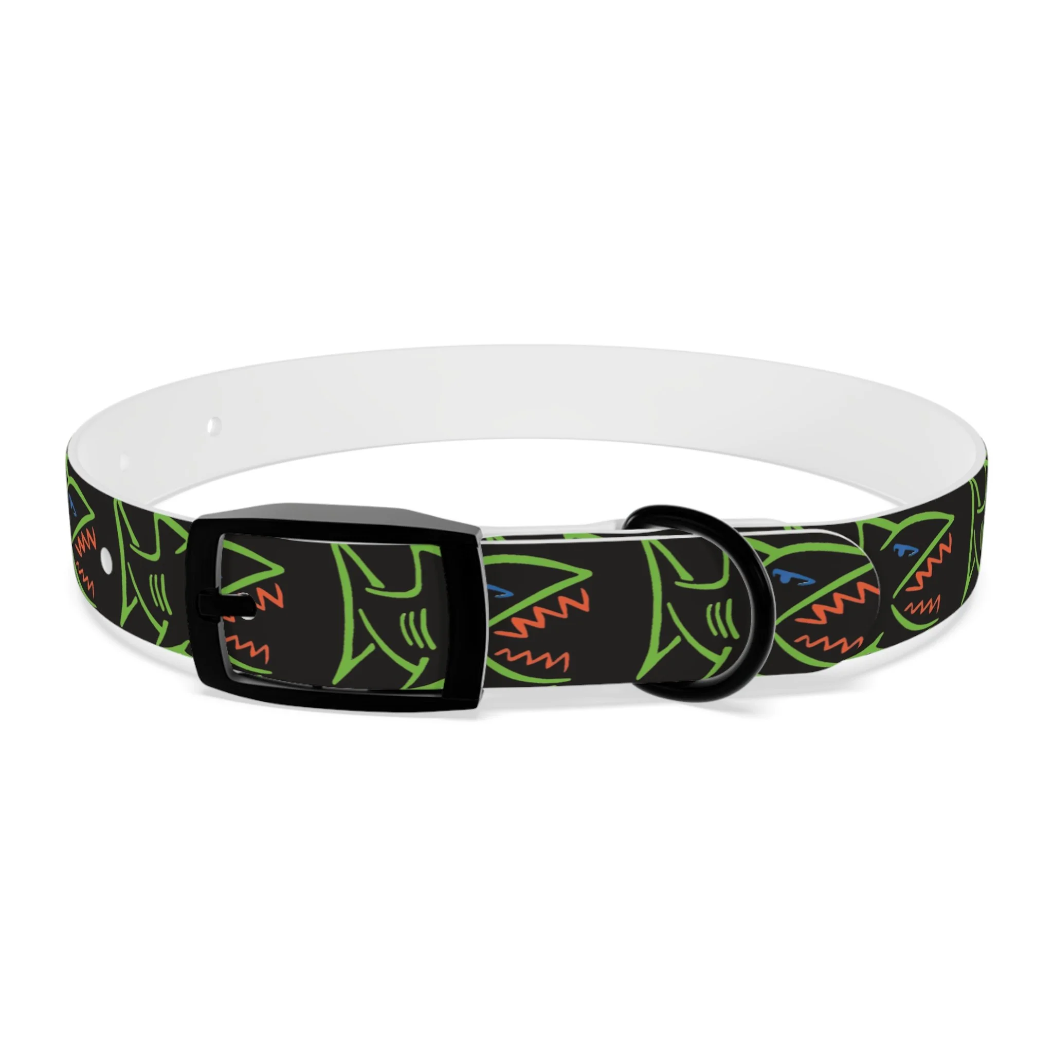 Lightweight, waterproof dog collar built for adventure and everyday mischief. The durable TPU band keeps its shape while staying flexible for comfort, and medical-grade, odor-resistant material means fewer baths and no lingering smells after puddle or park play. Choose from four anodized aluminum buckle finishes to match your pup’s personality — from matte onyx to warm vintage brass. Bold, neon shark motifs on a deep black background give this collar an urban, playful edge that reads well on both city walks and beach romps. Easy to wipe clean, hypoallergenic, and available in four sizes, it’s made to move with your dog through every splash, sniff, and sprint.