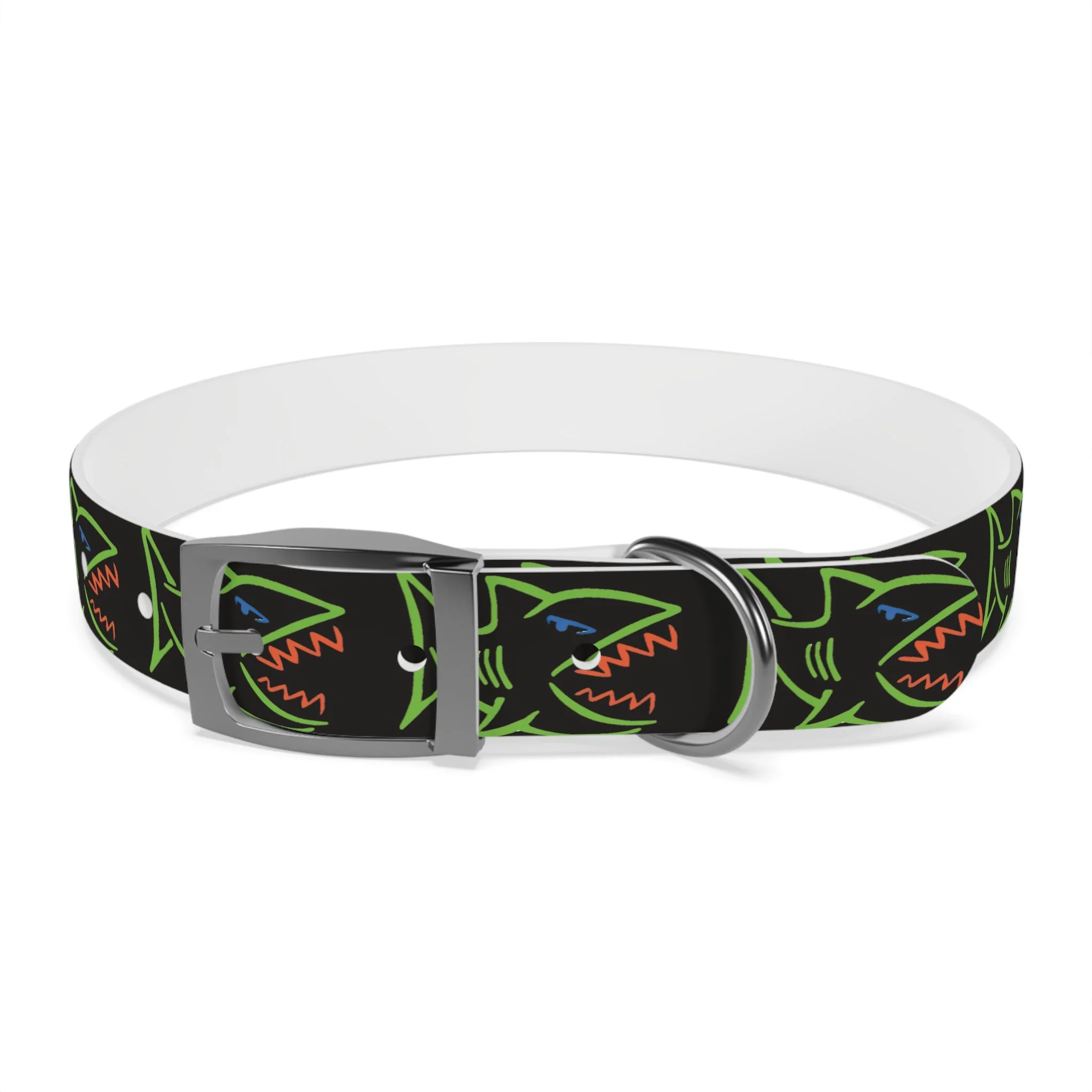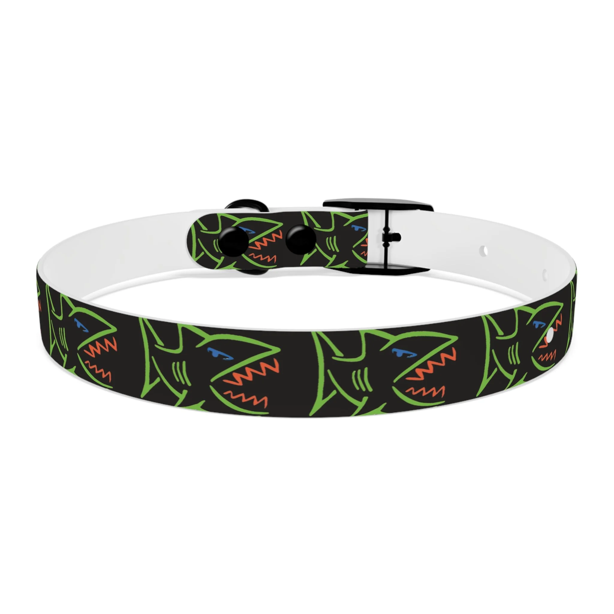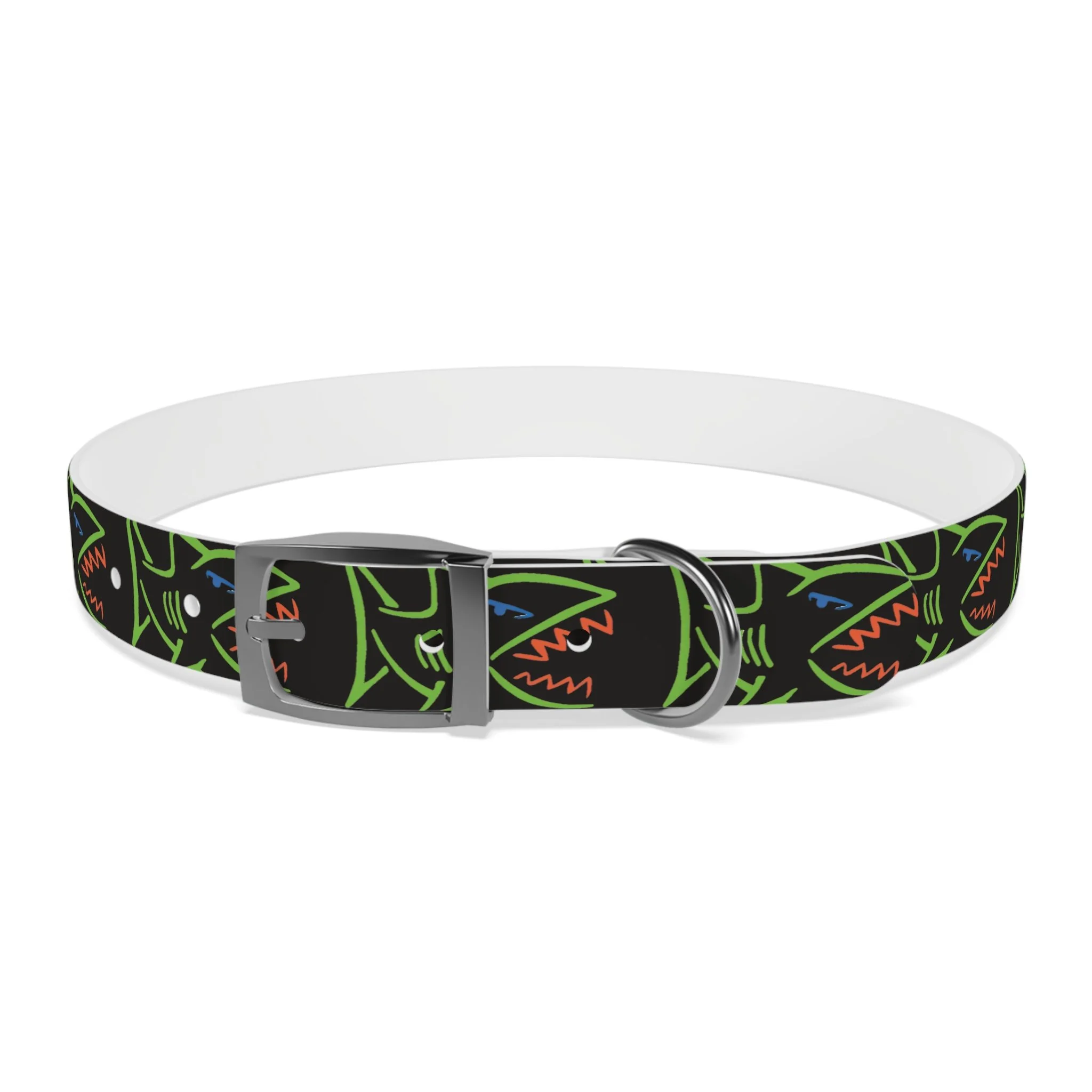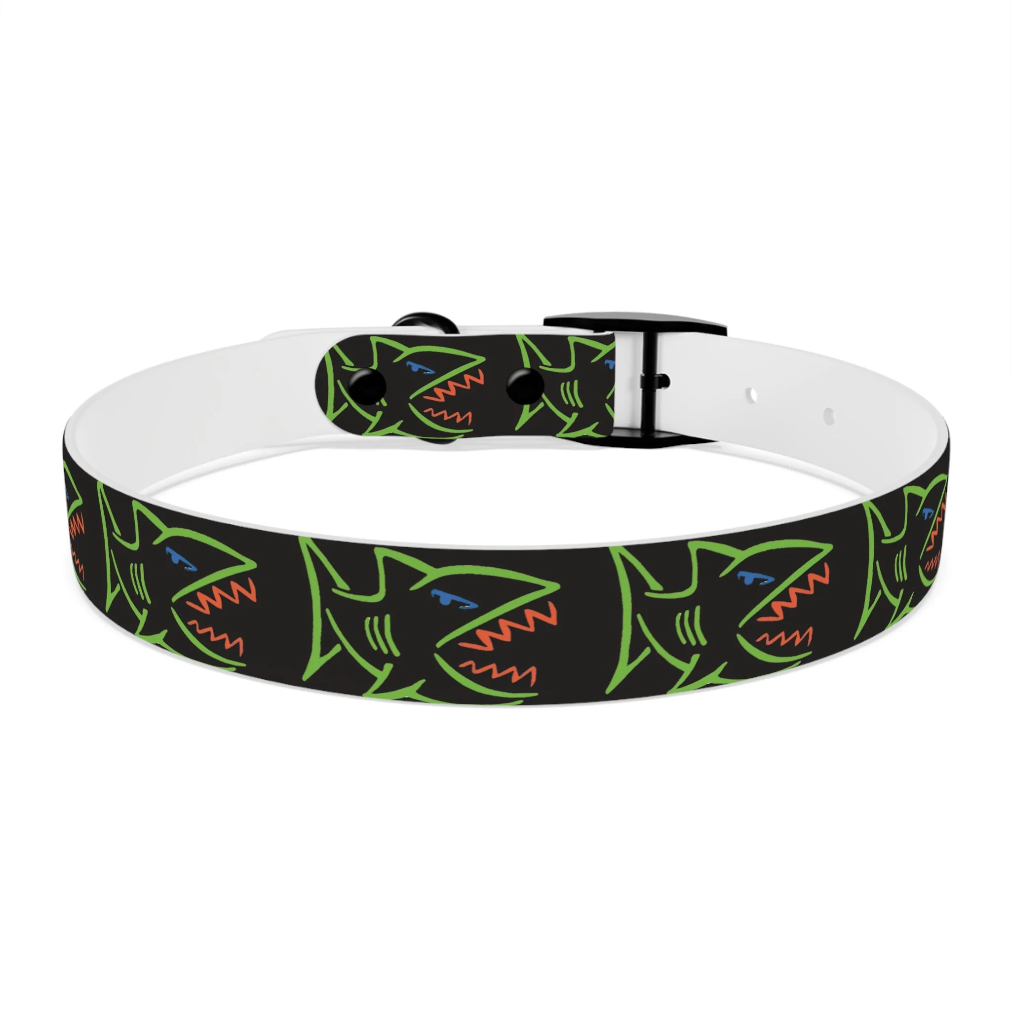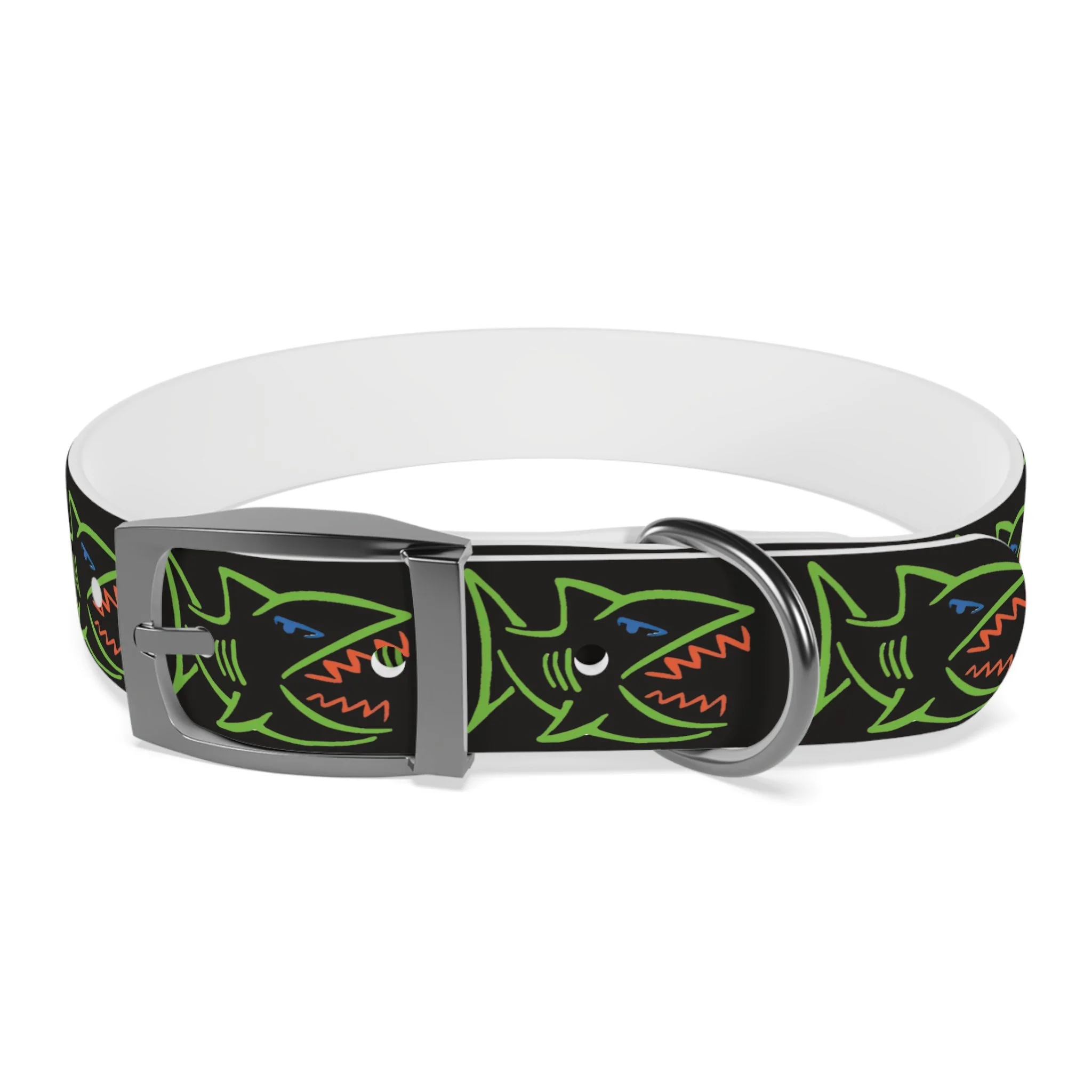 Lightweight, waterproof dog collar built for adventure and everyday mischief. The durable TPU band keeps its shape while staying flexible for comfort, and medical-grade, odor-resistant material means fewer baths and no lingering smells after puddle or park play. Choose from four anodized aluminum buckle finishes to match your pup’s personality — from matte onyx to warm vintage brass. Bold, neon shark motifs on a deep black background give this collar an urban, playful edge that reads well on both city walks and beach romps. Easy to wipe clean, hypoallergenic, and available in four sizes, it’s made to move with your dog through every splash, sniff, and sprint.