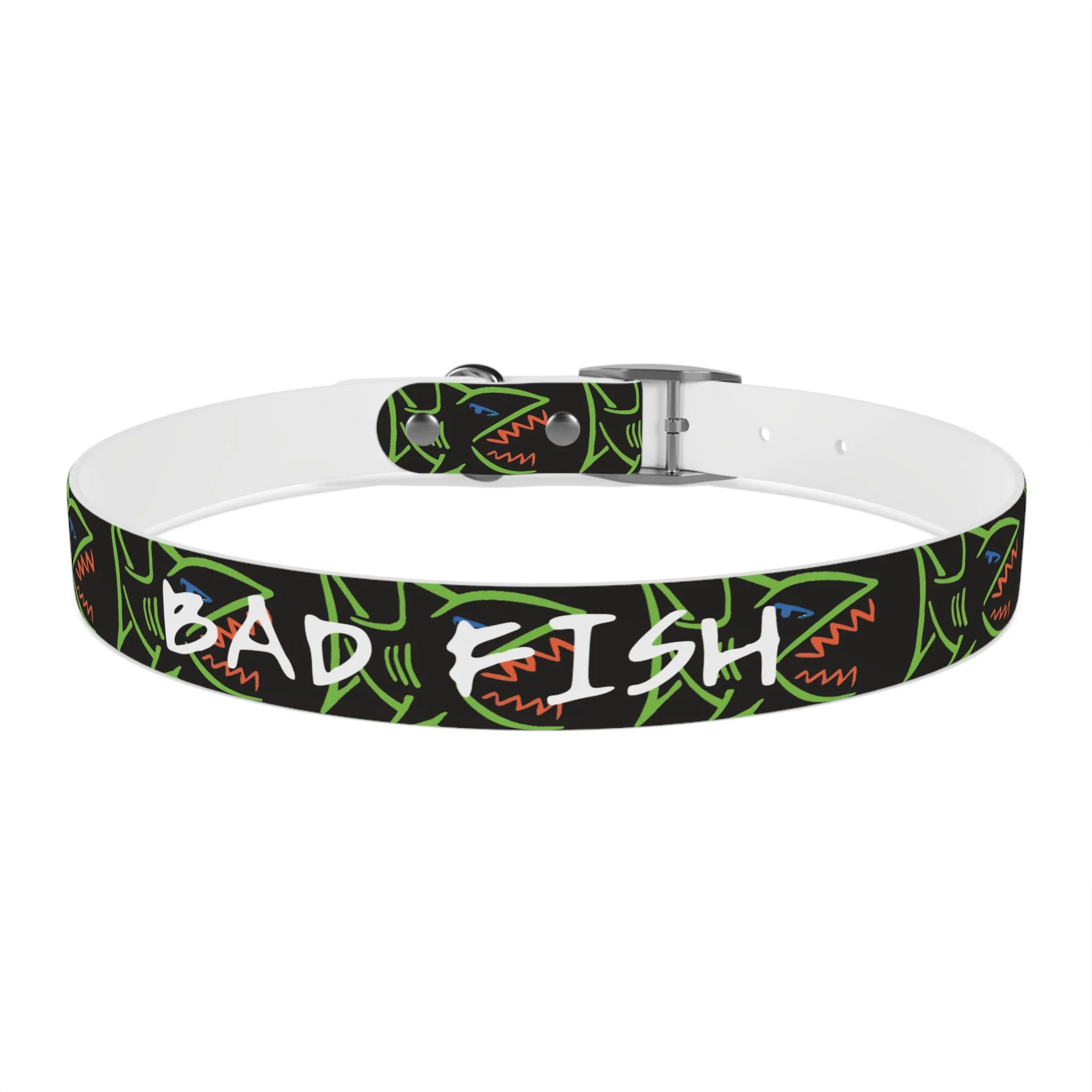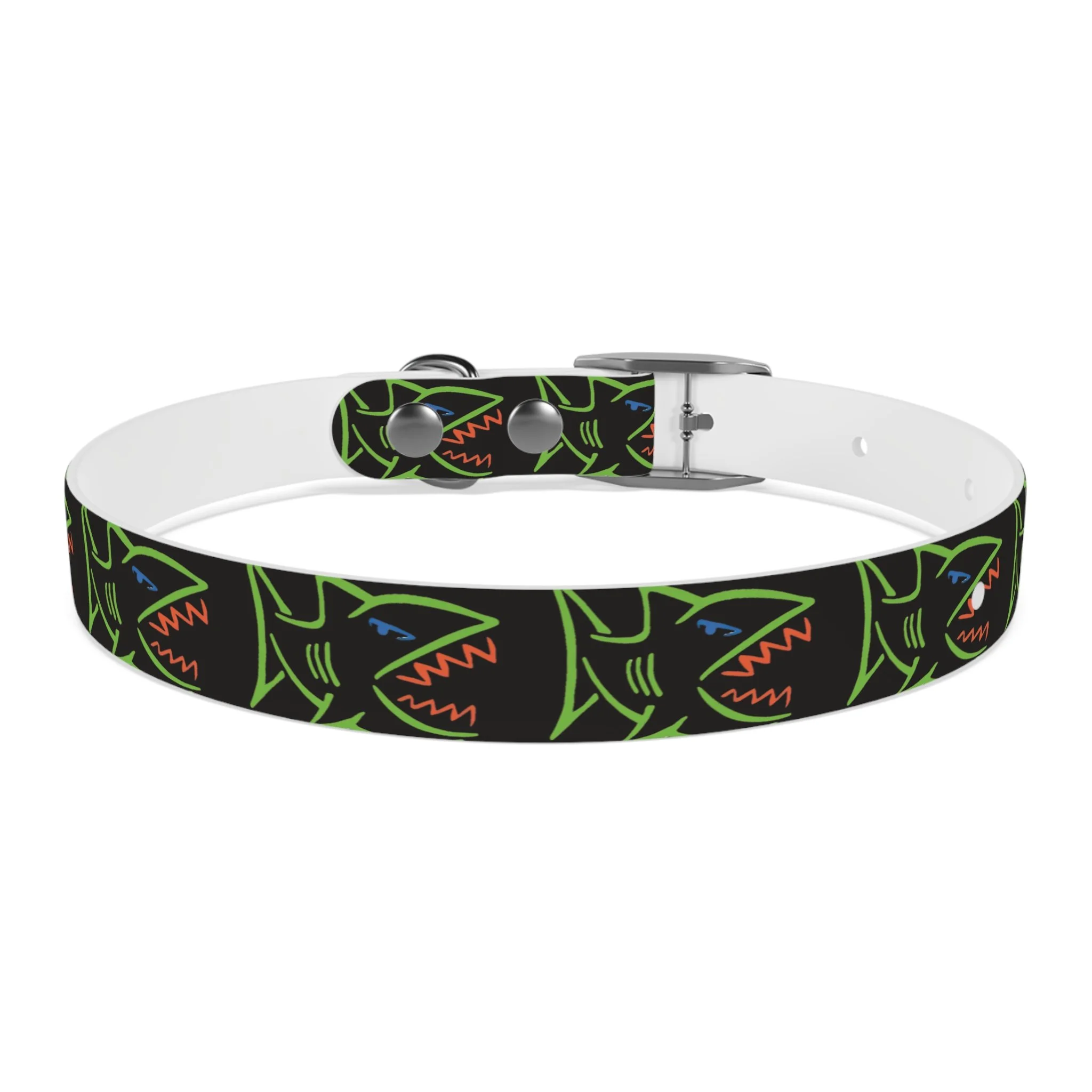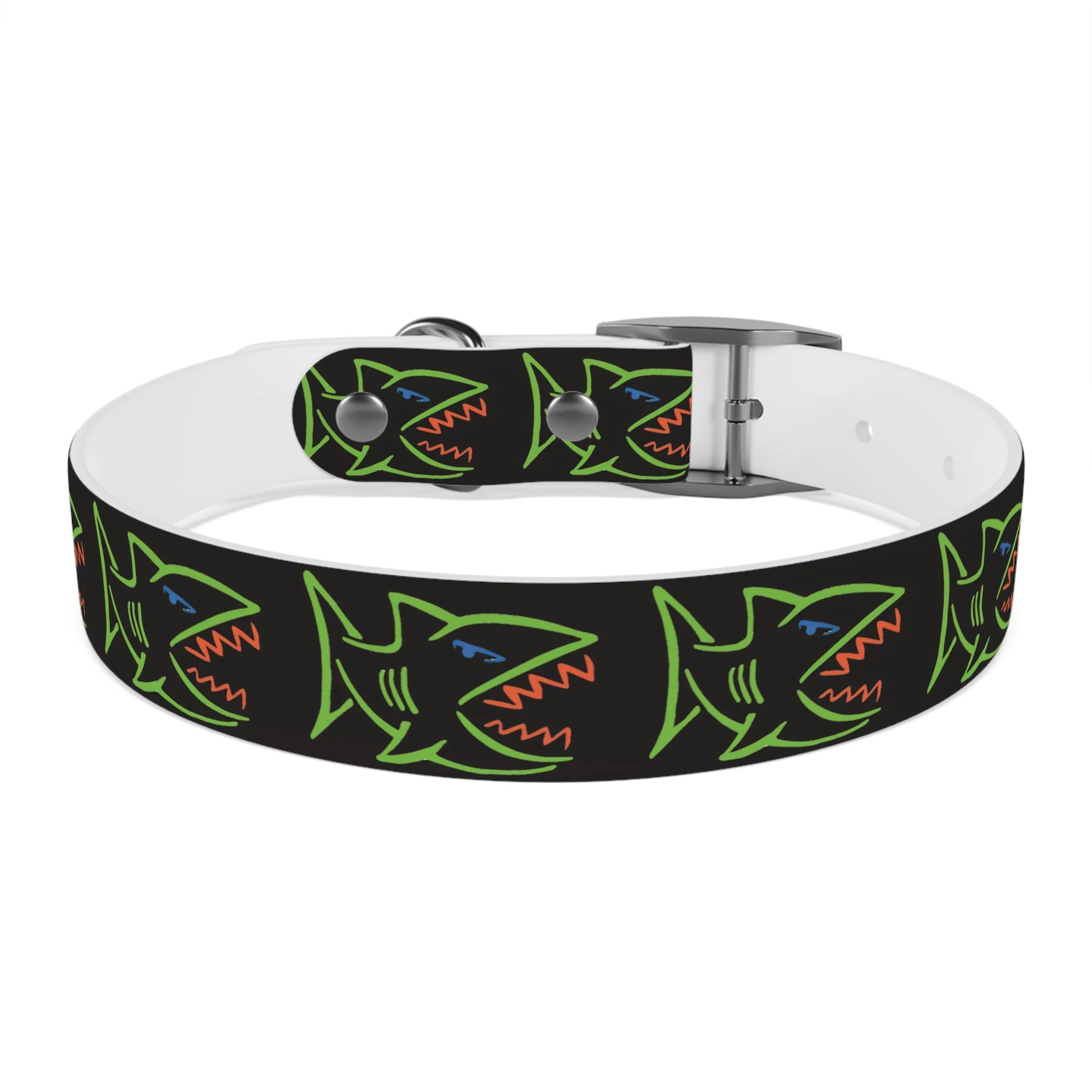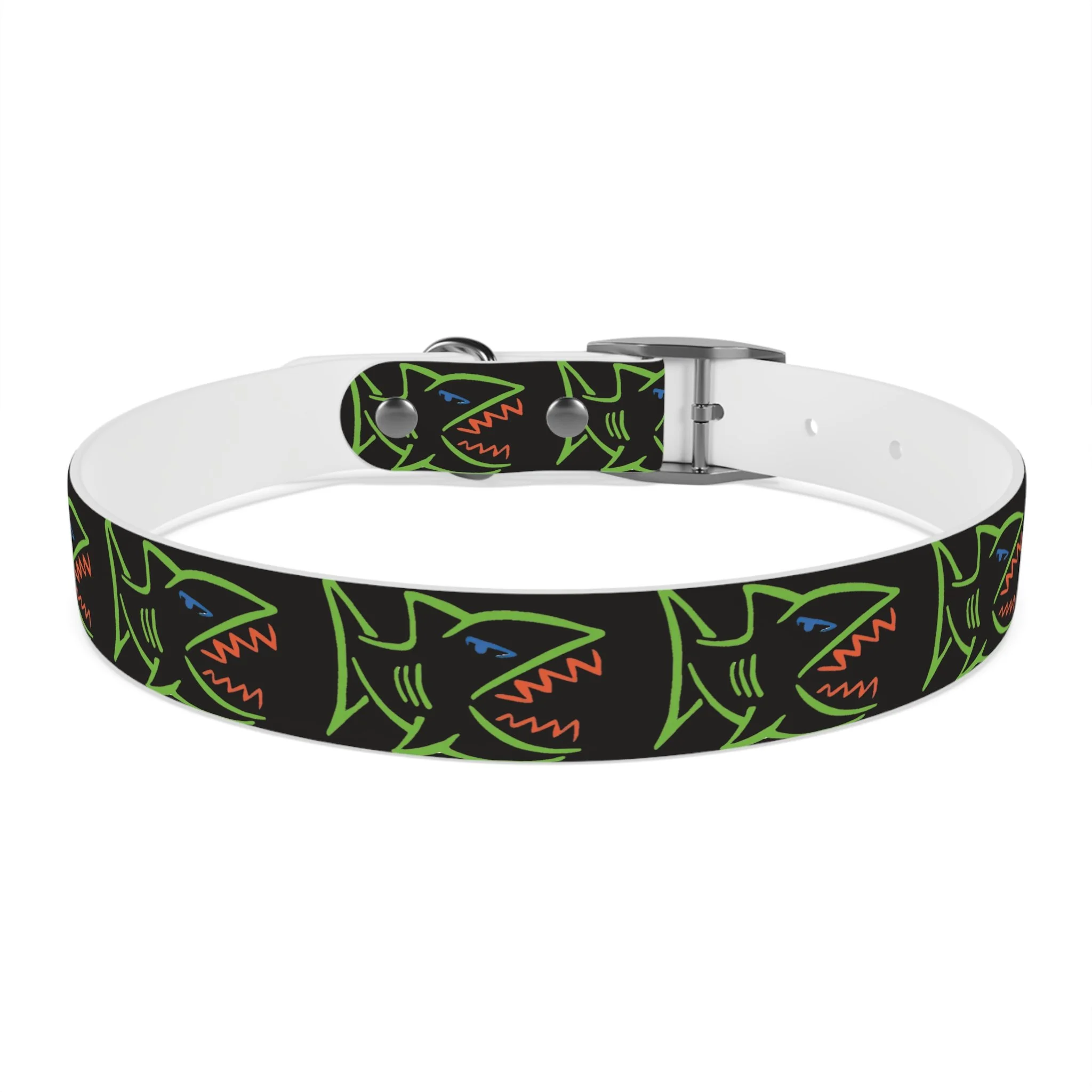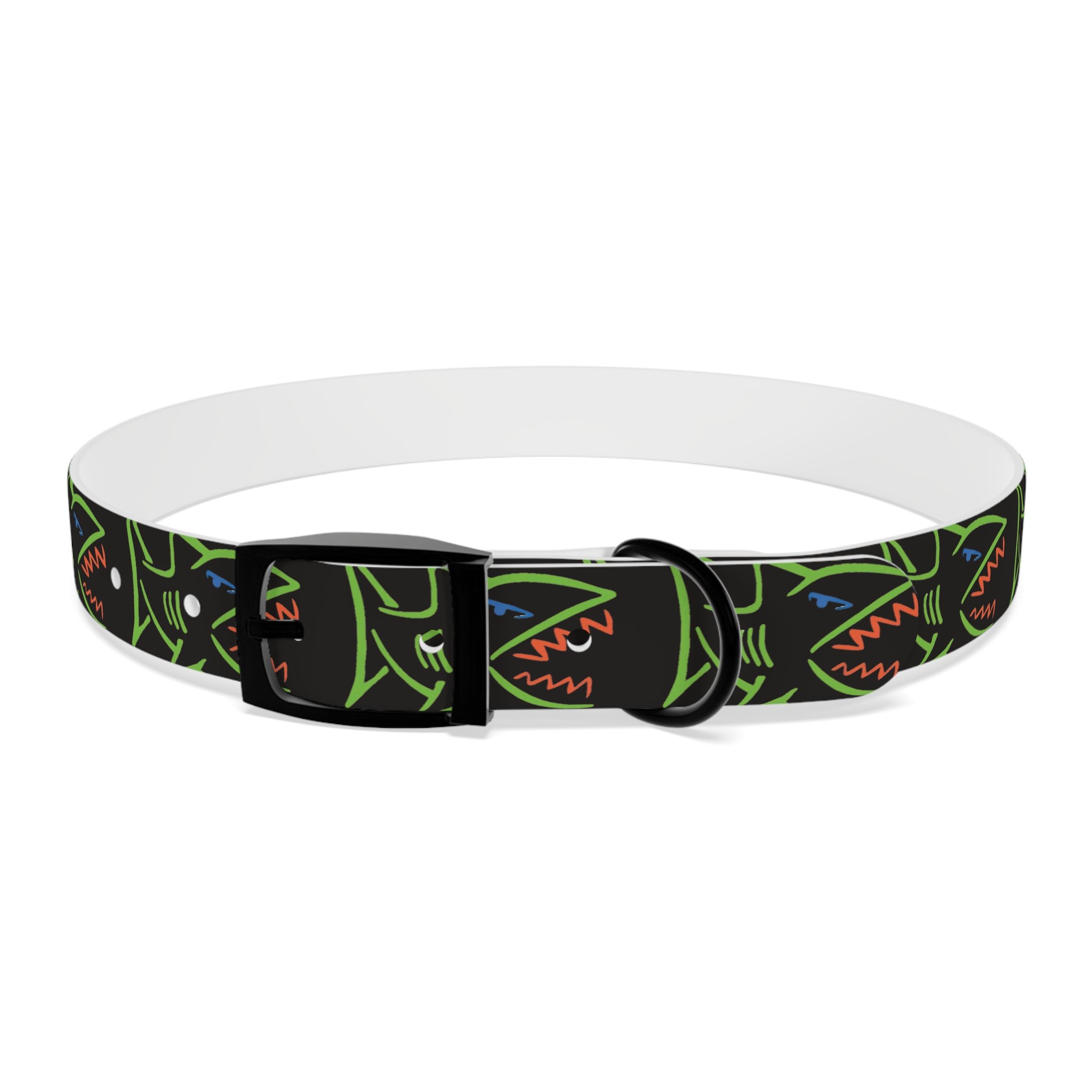 Lightweight, waterproof dog collar built for adventure and everyday mischief. The durable TPU band keeps its shape while staying flexible for comfort, and medical-grade, odor-resistant material means fewer baths and no lingering smells after puddle or park play. Choose from four anodized aluminum buckle finishes to match your pup’s personality — from matte onyx to warm vintage brass. Bold, neon shark motifs on a deep black background give this collar an urban, playful edge that reads well on both city walks and beach romps. Easy to wipe clean, hypoallergenic, and available in four sizes, it’s made to move with your dog through every splash, sniff, and sprint.