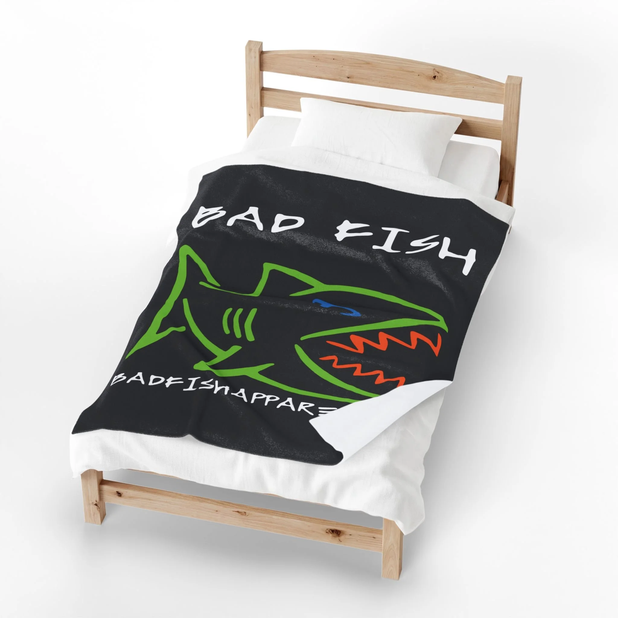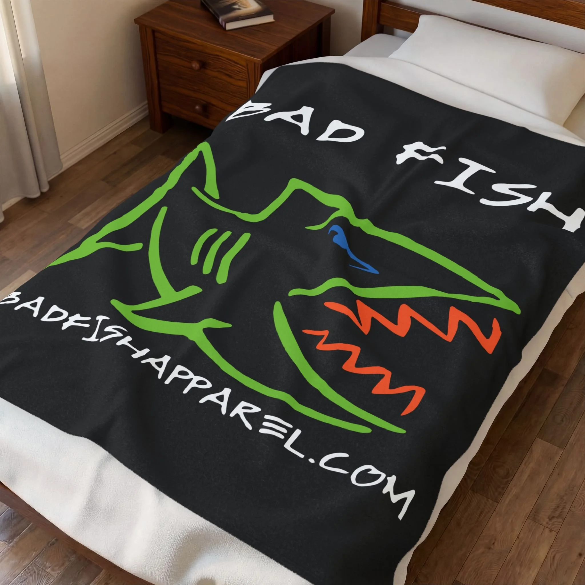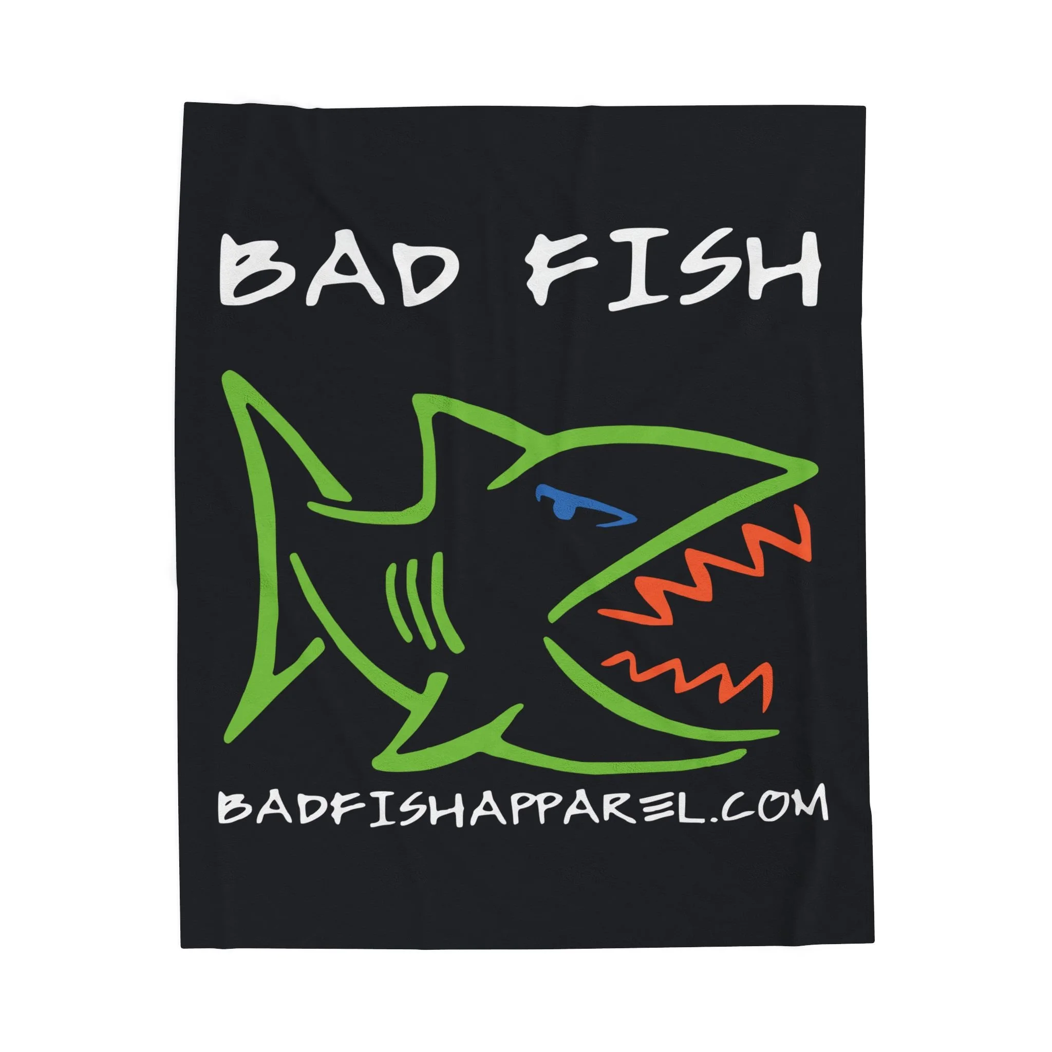 A velveteen plush blanket that brings bold, beach-town attitude to chilly nights. The brushed polyester surface holds vibrant, high-contrast prints—here a neon-green, orange-and-blue shark logo and hand-lettered "BAD FISH"—that pop against deep black. It drapes like a cozy layer over a couch or folds into a travel companion for bonfire evenings, offering both warmth and streetwise personality. The medium heavy-weight fabric feels luxuriously soft against skin while staying easy to care for and quick to dry. Durable double-needle stitched edges keep the shape wash after wash, and the single-sided print delivers sharp, detailed color where it counts.